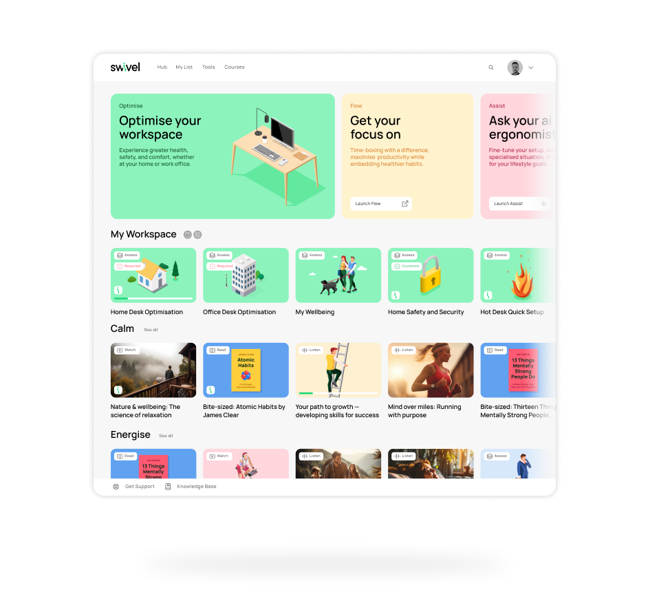 Swivel’s expert system designed by leading ergonomists, occupational therapists and data scientists is an ergonomics, wellbeing, and productivity suite to help workers prevent pain, improve mental resilience, and work smarter every day. Start building a healthier, more productive workplace today.