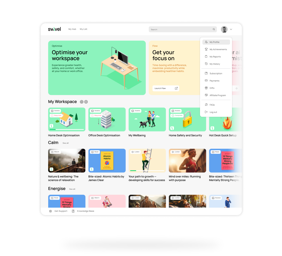Healthy work habits don’t happen by accident. Swivel Hub gives employees on-demand access to expert-backed wellbeing content, helping them stay active, engaged, and resilient, every day.